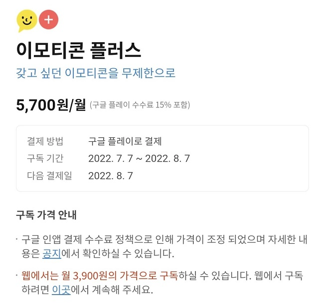 쇼핑하기, 배달하기 등 실물 상품 결제에는 해당사항이 없지만, 구독하기, 이모티콘, 게임 아이템 등 디지털 상품은 최대 30% 수수료를 받아갑니다.