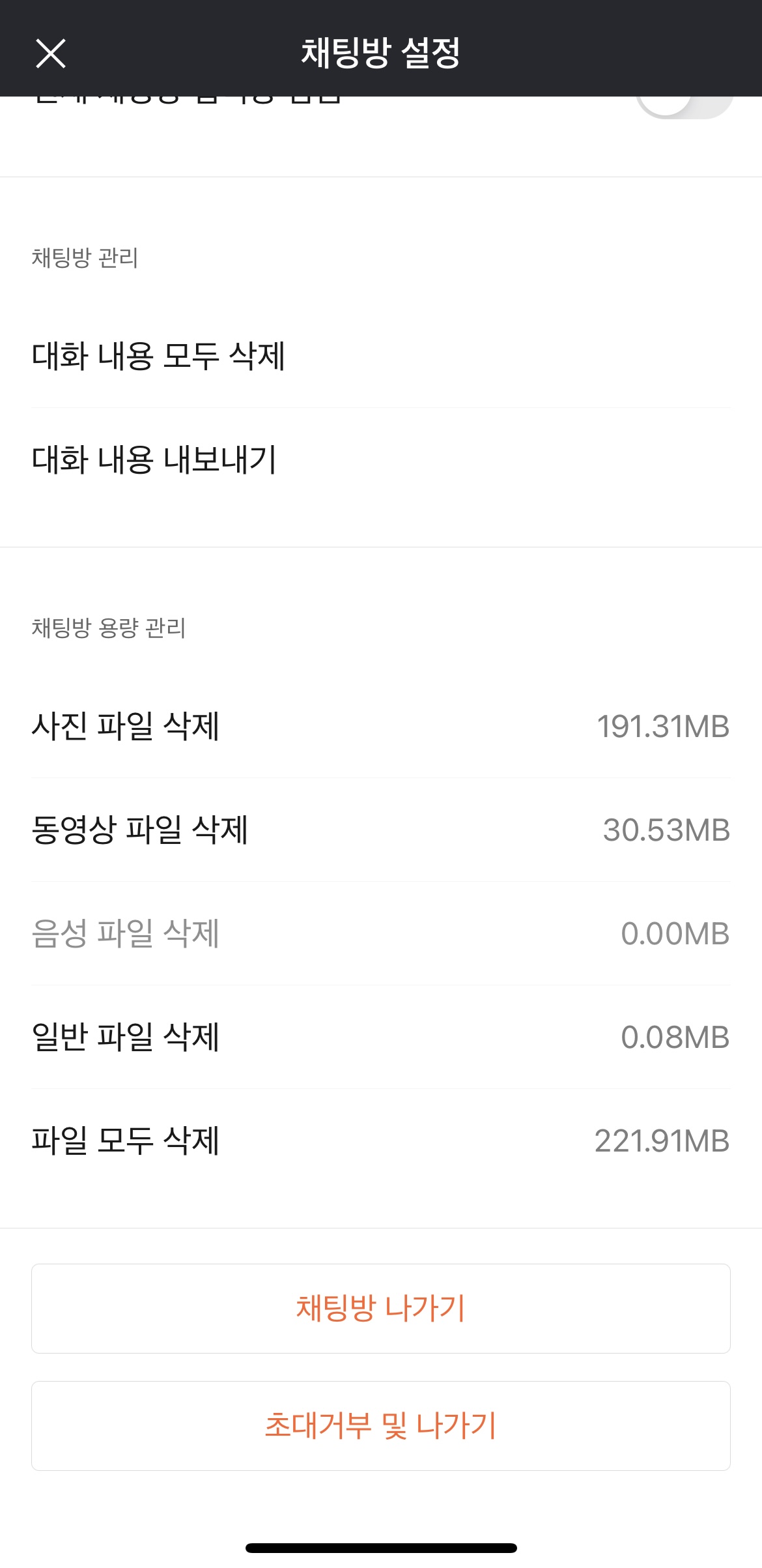 체팅방 우측 상단 삼선 > 우측 하단 톱니바퀴 > 맨 아래 초대 거부 및 나가기