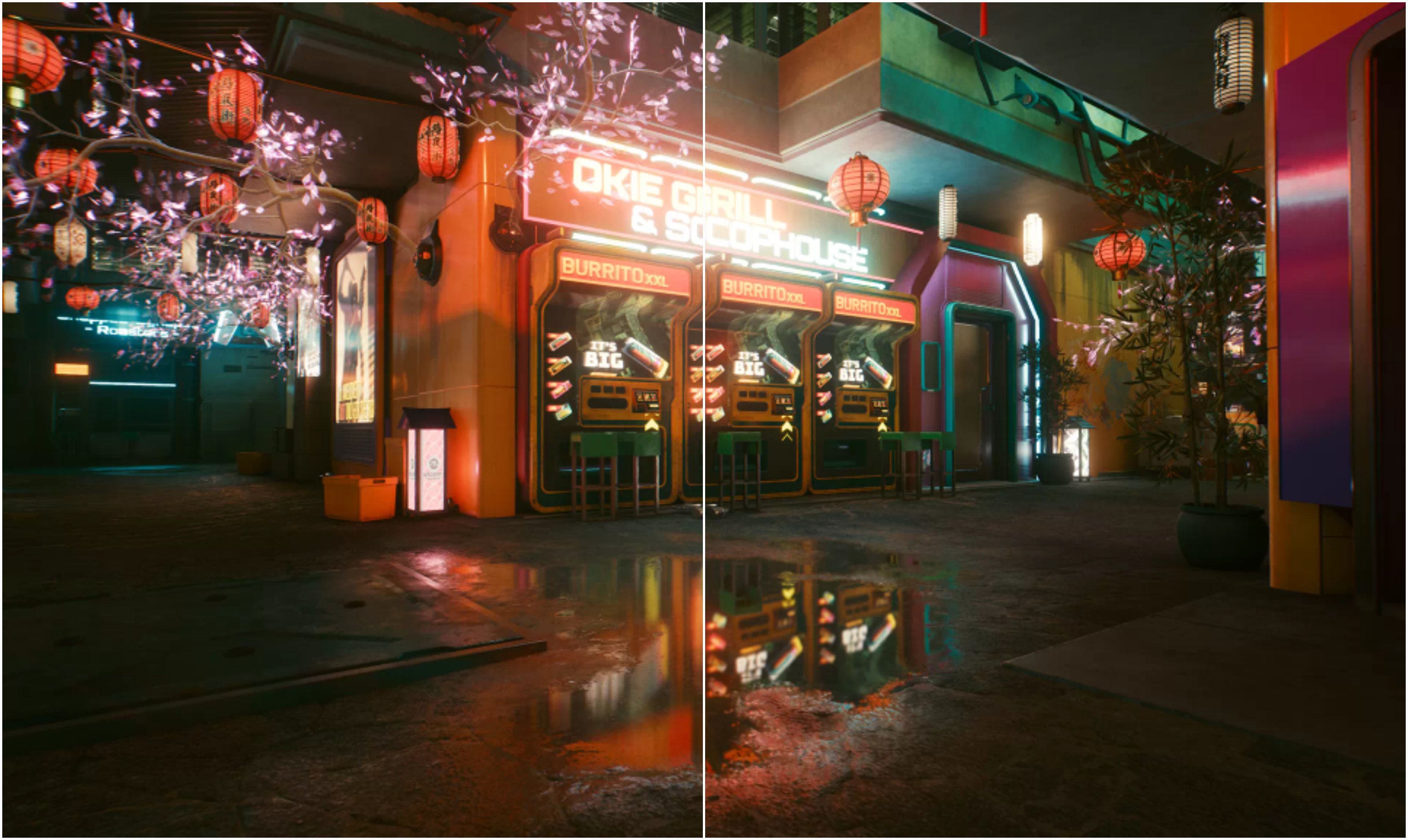 사이버펑크 2077의 경우 아래쪽에 물 반사까지 엄청난 표현력을 보여주죠.