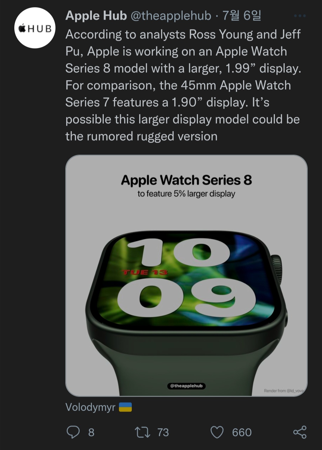 디자이너 볼로드미르가 트위터에서 이번에 출시할 애플워치 8 디자인을 강하게 예상했습니다.