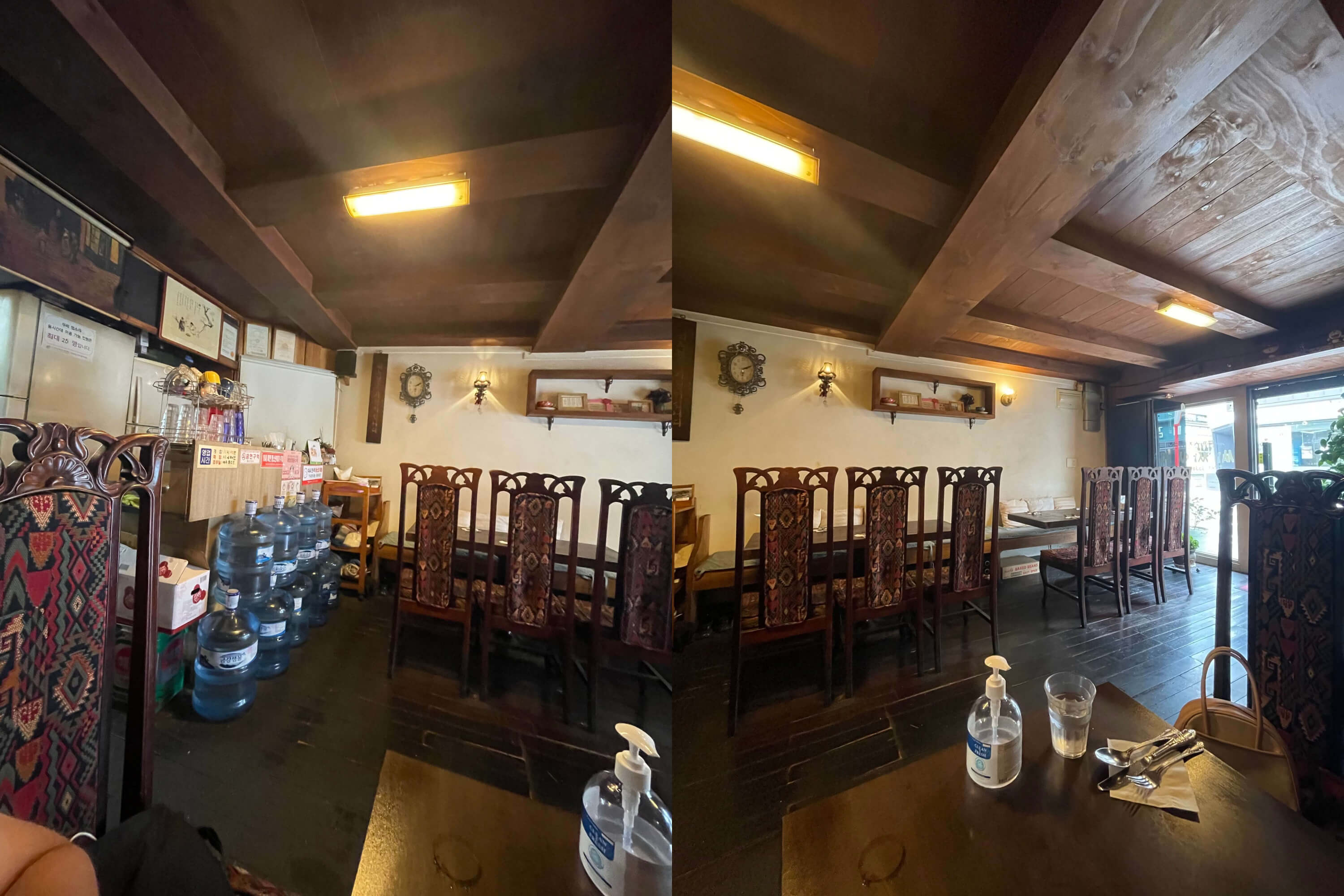 경양식 돈가스 전문점 씨싸이드의 1층 내부 모습입니다. 필자가 전에 다녔던 10년 전 모습과 달라지지 않았습니다. 음식점에 들어가면 사장님께서 물과 포크, 나이프, 수저를 가져다줍니다. 물은 다 마시면 항상 주전자로 사장님께서 가져다주십니다.