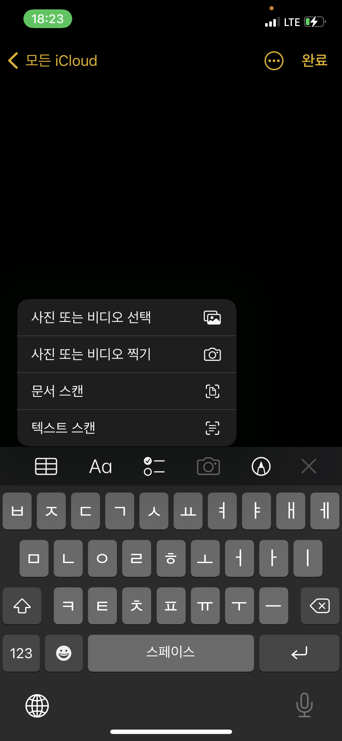 메모 기본 어플에 들어간 후 키보드 위에 카메라 버튼을 누릅니다.